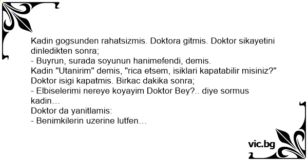 Kadin gogsunden rahatsizmis. Doktora gitmis. Doktor sikayetini dinledikten sonra;
