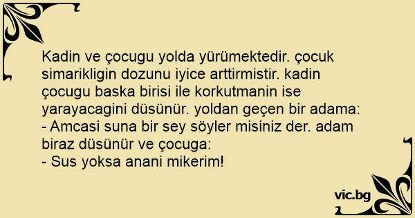 Kadin ve çocugu yolda yürümektedir. çocuk simarikligin dozunu iyice arttirmistir. kadin çocugu baska birisi ile korkutmanin ise yarayacagini düsünür. yoldan geçen bir adama: