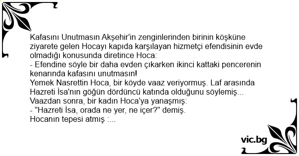 Kafasını Unutmasın Akşehir'in zenginlerinden birinin köşküne ziyarete gelen Hocayı kapıda karşılayan hizmetçi efendisinin evde olmadığı konusunda diretince Hoca: