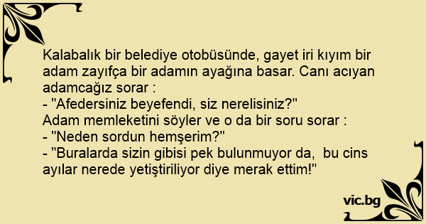 Kalabalık bir belediye otobüsünde, gayet iri kıyım bir adam zayıfça bir adamın ayağına basar. Canı acıyan adamcağız sorar :