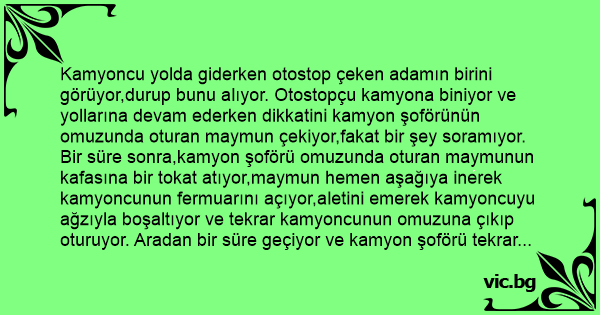 Kamyoncu yolda giderken otostop çeken adamın birini görüyor,durup bunu alıyor. Otostopçu kamyona biniyor ve yollarına devam ederken dikkatini kamyon şoförünün omuzunda oturan maymun çekiyor,fakat bir şey soramıyor. Bir süre sonra,kamyon şoförü omuzunda oturan maymunun kafasına bir tokat atıyor,maymun hemen aşağıya inerek kamyoncunun fermuarını açıyor,aletini emerek kamyoncuyu ağzıyla boşaltıyor ve tekrar kamyoncunun omuzuna çıkıp oturuyor. Aradan bir süre geçiyor ve kamyon şoförü tekrar maymunun kafasına bir tokat atıyor,maymun aynı işlemi tekrarlıyor. Tekrar şoförün omuzuna oturduktan sonra kamyon şoförü otostopçuya dönerek sen de ister misin diye soruyor. Otostopçunun cevabı,İsterim ama kafama sert vurmayacaksın.