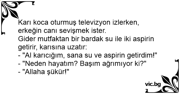 - "Al karıcığım, sana su ve aspirin getirdim!"