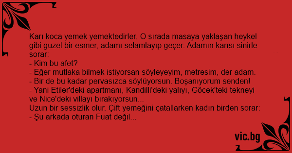 Karı koca yemek yemektedirler. O sırada masaya yaklaşan heykel gibi güzel bir esmer, adamı selamlayıp geçer. Adamın karısı sinirle sorar: