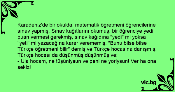 Karadeniz'de bir okulda, matematik öğretmeni öğrencilerine sınav yapmış. Sınav kağıtlarını okumuş, bir öğrenciye yedi puan vermesi gerekmiş, sınav kağıdına "yedi" mi yoksa "yeti" mi yazacağına karar verememiş. "Bunu bilse bilse Türkçe öğretmeni bilir" demiş ve Türkçe hocasına danışmış. Türkçe hocası da düşünmüş düşünmüş ve;