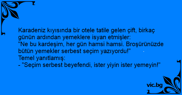 "Ne bu kardeşim, her gün hamsi hamsi. Broşürünüzde bütün yemekler serbest seçim yazıyordu!"