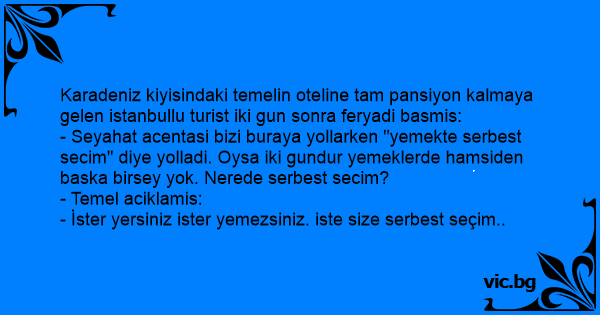 - Seyahat acentasi bizi buraya yollarken "yemekte serbest secim" diye yolladi. Oysa iki gundur yemeklerde hamsiden baska birsey yok. Nerede serbest secim?