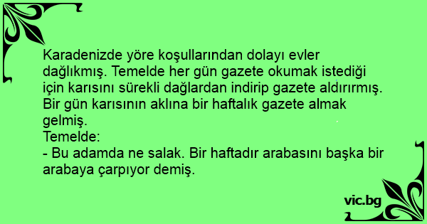 Karadenizde yöre koşullarından dolayı evler dağlıkmış. Temelde her gün gazete okumak istediği için karısını sürekli dağlardan indirip gazete aldırırmış.