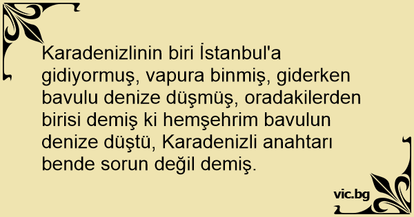 Karadenizlinin biri İstanbul'a gidiyormuş, vapura binmiş, giderken bavulu denize düşmüş, oradakilerden birisi demiş ki hemşehrim bavulun denize düştü, Karadenizli anahtarı bende sorun değil demiş.