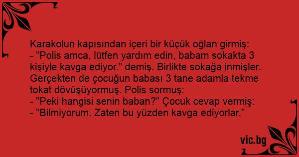 - "Polis amca, lütfen yardım edin, babam sokakta 3 kişiyle kavga ediyor." demiş. Birlikte sokağa inmişler. Gerçekten de çocuğun babası 3 tane adamla tekme tokat dövüşüyormuş. Polis sormuş: