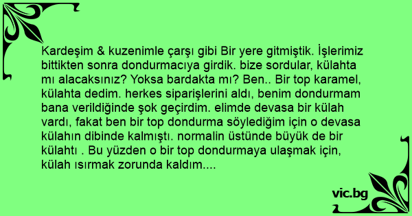 Kardeşim & kuzenimle çarşı gibi Bir yere gitmiştik. İşlerimiz bittikten sonra dondurmacıya girdik. bize sordular, külahta mı alacaksınız? Yoksa bardakta mı? Ben.. Bir top karamel, külahta dedim. herkes siparişlerini aldı, benim dondurmam bana verildiğinde şok geçirdim. elimde devasa bir külah vardı, fakat ben bir top dondurma söylediğim için o devasa külahın dibinde kalmıştı. normalin üstünde büyük de bir külahtı . Bu yüzden o bir top dondurmaya ulaşmak için, külah ısırmak zorunda kaldım. bildiğiniz külah yedim yani. Ve o gün dersimi aldım. Eğer o dondurmacıya gidersem, dondurmayı bardakta söyleyecektim.