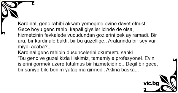 Kardinal, genc rahibi aksam yemegine evine davet etmisti. Gece boyu,genc rahip, kapali giysiler icinde de olsa, hizmetcinin fevkalade vucudundan gozlerini pek ayiramadi. Bir ara, bir kardinale bakti, bir bu guzellige.. Aralarinda bir sey var miydi acaba?..