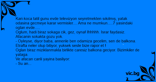 Kari-koca tatil gunu evde televizyon seyretmekten sıkılmış, yatak odasina gecmeye karar vermisler.... Ama ne mumkun.....7 yasindaki oglan evde.....