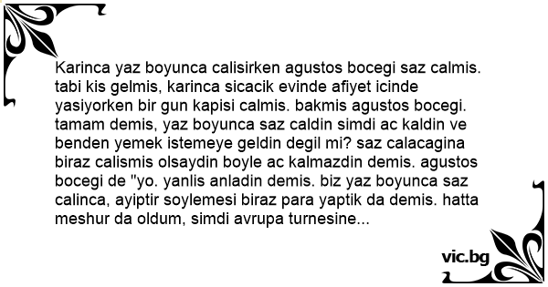 Karinca yaz boyunca calisirken agustos bocegi saz calmis. tabi kis gelmis, karinca sicacik evinde afiyet icinde yasiyorken bir gun kapisi calmis. bakmis agustos bocegi. tamam demis, yaz boyunca saz caldin simdi ac kaldin ve benden yemek istemeye geldin degil mi? saz calacagina biraz calismis olsaydin boyle ac kalmazdin demis. agustos bocegi de "yo. yanlis anladin demis. biz yaz boyunca saz calinca, ayiptir soylemesi biraz para yaptik da demis. hatta meshur da oldum, simdi avrupa turnesine cikiyorum. belki oralardan istedigin birseyler vardir, diye sormaya geldim" demis. karinca bir bakmis agustos boceginin hic oyle ac bir hali yok. uzerinde bir kurk var, arkada da kocaman bir limuzin, onunde soforu ile onu bekliyor. "yok, bir sey istemiyorum" demis. "ama fransaya ugrayacaksin degil mi?" diye sormus. agustos bocegi de "evet"demis. "iyi o zaman" demis, karinca "parise gidince orada la fontaine diye bir ipne var, onun yuzune bir tukur benim icin, oldu mu?"
