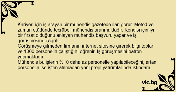 Kariyeri için iş arayan bir mühendis gazetede ilan görür. Metod ve zaman etüdünde tecrübeli mühendis aranmaktadır. Kendisi için iyi bir fırsat olduğunu anlayan mühendis başvuru yapar ve iş görüşmesine çağrılır.