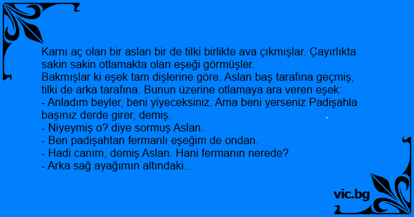 Tabii aslan, eşeğin arka ayağındaki fermanı okumaya çalışırken, eşek öyle bir tekme sallamış ki aslanı 10 metre geriye atarak bütün kemiklerini kırmış.