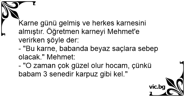 Karne günü gelmiş ve herkes karnesini almıştır. Öğretmen karneyi Mehmet'e verirken şöyle der: