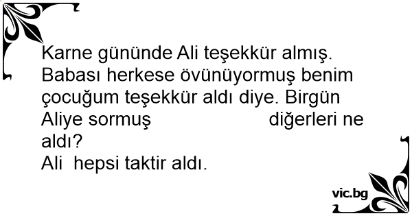 Karne gününde Ali teşekkür almış. Babası herkese övünüyormuş benim çocuğum teşekkür aldı diye. Birgün Aliye sormuş diğerleri ne aldı?