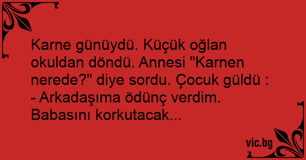 Karne günüydü. Küçük oğlan okuldan döndü. Annesi "Karnen nerede?" diye sordu. Çocuk güldü :