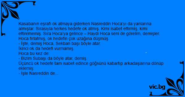 Kasabanın eşrafı ok atmaya giderken Nasreddin Hoca’yı da yanlarına almışlar. Sırasıyla herkes hedefe ok atmış. Kimi isabet ettirmiş, kimi ettirememiş. Sıra Hoca’ya gelince – Haydi Hoca seni de görelim, demişler.