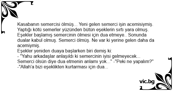 - "Yahu arkadaşlar anlaşıldı ki semercinin iyisi gelmeyecek... Semerci ölsün diye dua etmenin anlamı yok..." -"Peki ne yapalım?" -"Allah'a bizi eşeklikten kurtarması için dua edelim."