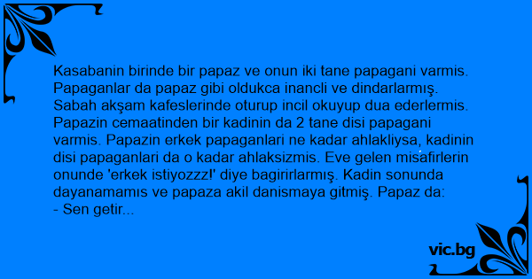 - Sen getir onlari bana benim papaganların kafesine koyalim da ahlak ogrensinler biraz, demiş. Kadin da almış papaganlari getirmiş papazin evine. Daha kafese girer girmez disi papaganlaradan birisi: