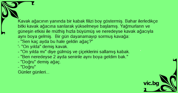 Kavak ağacının yanında bir kabak filizi boy göstermiş. Bahar ilerledikçe bitki kavak ağacına sarılarak yükselmeye başlamış. Yağmurların ve güneşin etkisi ile müthiş hızla büyümüş ve neredeyse kavak ağacıyla aynı boya gelmiş. Bir gün dayanamayıp sormuş kavağa:
