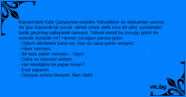 Kayseri'deki Kale Çarşısında eskiden Yahudilerin de dükkanları varmış. Bir gün Kayserili bir çocuk, elinde ortası delik irice bir altın, içerisinden lastik geçirmiş sallayarak oynuyor. Yahudi esnaf bu çocuğu görür de yerinde durabilir mi? Hemen çocuğun yanına gider;