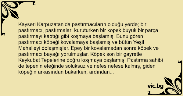Kayseri Karpuzatan’da pastırmacıların olduğu yerde; bir pastırmacı, pastırmaları kuruturken bir köpek büyük bir parça pastırmayı kaptığı gibi koşmaya başlamış. Bunu gören pastırmacı köpeği kovalamaya başlamış ve bütün Yeşil Mahalleyi dolaşmışlar. Epey bir kovalamadan sonra köpek ve pastırmacı bayağı yorulmuşlar. Köpek son bir gayretle Keykubat Tepelerine doğru koşmaya başlamış. Pastırma sahibi de tepenin eteğinde soluksuz ve nefes nefese kalmış, giden köpeğin arkasından bakarken, ardından bağırmış: