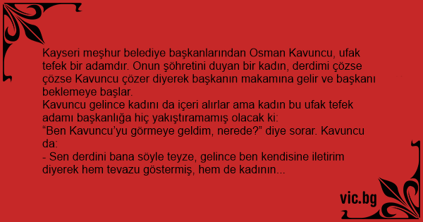 Kayseri meşhur belediye başkanlarından Osman Kavuncu, ufak tefek bir adamdır. Onun şöhretini duyan bir kadın, derdimi çözse çözse Kavuncu çözer diyerek başkanın makamına gelir ve başkanı beklemeye başlar.