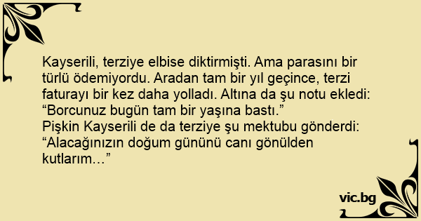Kayserili, terziye elbise diktirmişti. Ama parasını bir türlü ödemiyordu. Aradan tam bir yıl geçince, terzi faturayı bir kez daha yolladı. Altına da şu notu ekledi: