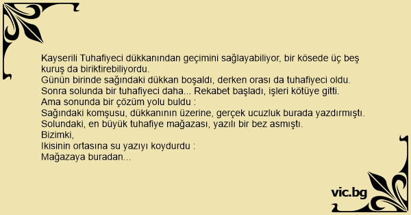 Günün birinde sağındaki dükkan boşaldı, derken orası da tuhafiyeci oldu. Sonra solunda bir tuhafiyeci daha... Rekabet başladı, işleri kötüye gitti.