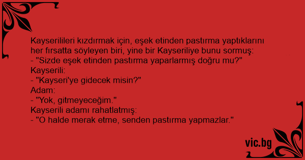 Kayserilileri kızdırmak için, eşek etinden pastırma yaptıklarını her fırsatta söyleyen biri, yine bir Kayseriliye bunu sormuş: