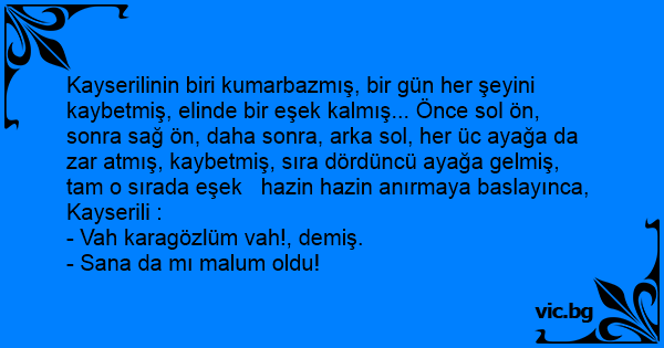 Kayserilinin biri kumarbazmış, bir gün her şeyini kaybetmiş, elinde bir eşek kalmış... Önce sol ön, sonra sağ ön, daha sonra, arka sol, her üc ayağa da zar atmış, kaybetmiş, sıra dördüncü ayağa gelmiş, tam o sırada eşek hazin hazin anırmaya baslayınca, Kayserili :