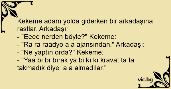Kekeme adam yolda giderken bir arkadaşına rastlar. Arkadaşı: