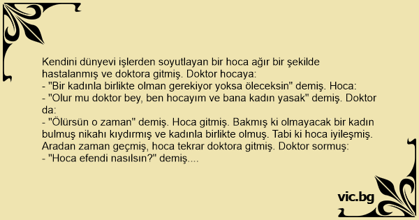 - "Ölürsün o zaman" demiş. Hoca gitmiş. Bakmış ki olmayacak bir kadın bulmuş nikahı kıydırmış ve kadınla birlikte olmuş. Tabi ki hoca iyileşmiş. Aradan zaman geçmiş, hoca tekrar doktora gitmiş. Doktor sormuş: