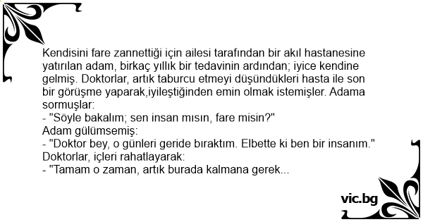Kendisini fare zannettiği için ailesi tarafından bir akıl hastanesine yatırılan adam, birkaç yıllık bir tedavinin ardından; iyice kendine gelmiş. Doktorlar, artık taburcu etmeyi düşündükleri hasta ile son bir görüşme yaparak,iyileştiğinden emin olmak istemişler. Adama sormuşlar: