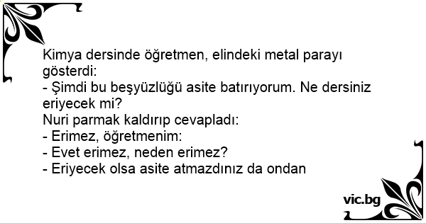 Suvalkiečių mokykloje vyksta chemijos pamoka: - Mokiniai, matote, aš dedu šią monetą į spiritą. Kaip manote, ar ji ištirps? - Žinoma, kad ne! - Teisingai, o kodėl? - Jei ji galėtų ištirpti, tai jūs...