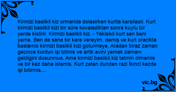 Kirmizi baslikli kiz ormanda dolasirken kurtla karsilasir. Kurt kirmizi baslikli kizi bir süre kovaladiktan sonra kuytu bir yerde kistirir. Kirmizi baslikli kiz. - Yakisikli kurt sen beni yeme. Ben de sana bir kere vereyim. demiş ve kurt oracikta baslamis kirmizi baslikli kizi goturmeye. Aradan biraz zaman gecince kurdun işi bitmis ve artik avini yemek zamanı geldigini dusunmus. Ama kirmizi baslikli kiz tatmin olmamis ve bir kez daha istemis. Kurt zaten dunden razi İkinci kezde işi bitirmis. Bu şöyle altinci yedinci derken kurt kirmizi baslikli kizin üzerine yigilivermis. Kirmizi baslikli kiz da pantolonunu giyip babaannesinin evinin yolunu tutmus. Yolda bekci ile karsilasmislar. Bekci kirmizi baslikli kizi yakaladigi gibi asilmis kulagina. - Bak kizim bu, bu hafta üçüncü kurt. bir daha olmasin. - Kirmizi baslikli kizdan yanit gelir bi kerem verim beni birak.