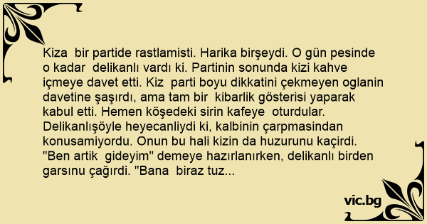 Kiza bir partide rastlamisti. Harika birşeydi. O gün pesinde o kadar delikanlı vardı ki. Partinin sonunda kizi kahve içmeye davet etti. Kiz parti boyu dikkatini çekmeyen oglanin davetine şaşırdı, ama tam bir kibarlik gösterisi yaparak kabul etti. Hemen köşedeki sirin kafeye oturdular. Delikanlışöyle heyecanliydi ki, kalbinin çarpmasindan konusamiyordu. Onun bu hali kizin da huzurunu kaçirdi. "Ben artik gideyim" demeye hazırlanırken, delikanlı birden garsınu çağırdi. "Bana biraz tuz getirir misiniz" dedi. "Kahveme koymak için. "Yan masalardan bile saskin yüzler delikanlıya bakti. Kahveye tuz!. Delikanlı kipkırmızı oldu utançtan, ama tuzu kahvesine döktü ve içmeye başladı. Kiz, merakla " garip bir agiz tadiniz var" dedi. Delikanlı anlatti: