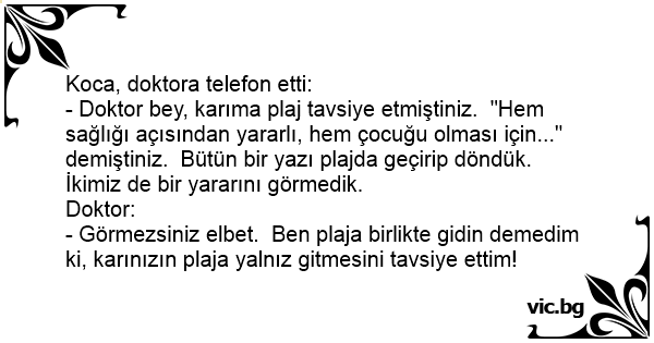 - Doktor bey, karıma plaj tavsiye etmiştiniz. "Hem sağlığı açısından yararlı, hem çocuğu olması için..." demiştiniz. Bütün bir yazı plajda geçirip döndük. İkimiz de bir yararını görmedik.