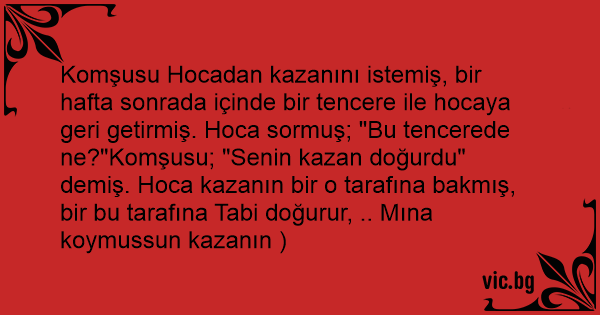 Komşusu Hocadan kazanını istemiş, bir hafta sonrada içinde bir tencere ile hocaya geri getirmiş. Hoca sormuş; "Bu tencerede ne?"Komşusu; "Senin kazan doğurdu" demiş. Hoca kazanın bir o tarafına bakmış, bir bu tarafına Tabi doğurur, .. Mına koymussun kazanın )