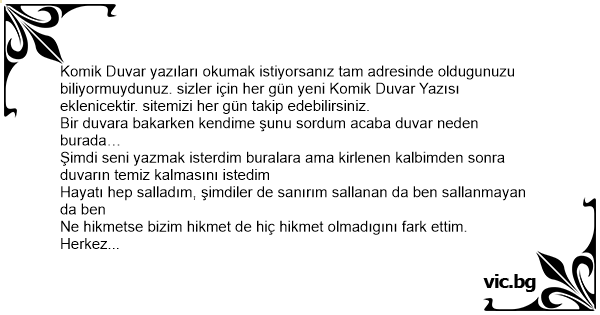Komik Duvar yazıları okumak istiyorsanız tam adresinde oldugunuzu biliyormuydunuz. sizler için her gün yeni Komik Duvar Yazısı eklenicektir. sitemizi her gün takip edebilirsiniz.