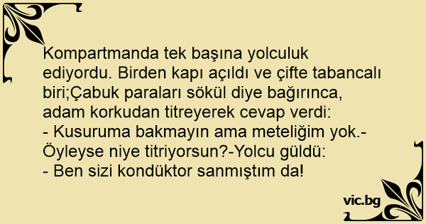 Kompartmanda tek başına yolculuk ediyordu. Birden kapı açıldı ve çifte tabancalı biri;Çabuk paraları sökül diye bağırınca, adam korkudan titreyerek cevap verdi: