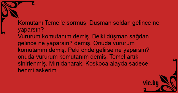 Vururum komutanım demiş. Belki düşman sağdan gelince ne yaparsın? demiş. Onuda vururum komutanım demiş. Peki önde gelirse ne yaparsın? onuda vururum komutanım demiş. Temel artık sinirlenmiş. Mırıldanarak. Koskoca alayda sadece benmi askerim.