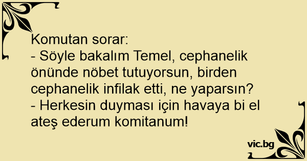 - Söyle bakalım Temel, cephanelik önünde nöbet tutuyorsun, birden cephanelik infilak etti, ne yaparsın?