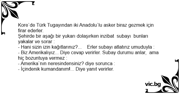 - Biz Amerikalıyız... Diye cevap verirler. Subay durumu anlar, ama hiç bozuntuya vermez :