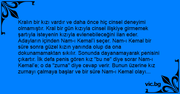 Kralın bir kızı vardır ve daha önce hiç cinsel deneyimi olmamıştır. Kral bir gün kızıyla cinsel ilişkiye girmemek şartıyla isteyenin kızıyla evlenebileceğini ilan eder. Adayların içinden Nam-ı Kemal’i seçer. Nam-ı Kemal bir süre sonra güzel kızın yanında olup da ona dokunamamaktan sıkılır. Sonunda dayanamayarak penisini çıkartır. İlk defa реnis gören kız "bu ne" diye sorar Nam-ı Kemal’e; o da "zurna" diye cevap verir. Bunun üzerine kız zurnayı çalmaya başlar ve bir süre Nam-ı Kemal olayı böyle götürür. Kemal sonunda sıkılır ve bir gün kız zurnayı istediğinde onu bahçede kaybettiğini söyler.. Kız da babasına Nam-ı Kemal’in zurnasının bulunmasını istediğini söyler. Bütün saray bahçede Kemal’in zurnasını aramaya başlar, kız etrafa bakarken bir anda babasının elbisesinin altından sarkan penisi görür ve babasına "baba, baba işte zurna burda" der ve çekiştirmeye başlar. Telaşlanan kral, "kızım bırak o annenin zurnası" der..