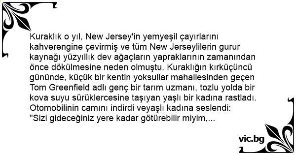 Dedi. Iki üç adımlık yolum kaldı. Greenfield, kadının bir kova suyu ne yapacağını merak etti. Onu arkasından izledi. Yaşlı kadının, zorlukla taşıdığı kovayı bahçenin uzak bir köşesindeki büyük meşe ağacına kadar sürükleyip, sonra da kovadaki suyla meşe ağacını suladığını görünce, hem hayran kaldı, hem de şaşırdı. Yanına yaklaştı ve sordu: