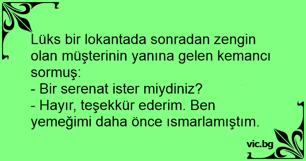 Lüks bir lokantada sonradan zengin olan müşterinin yanına gelen kemancı sormuş: