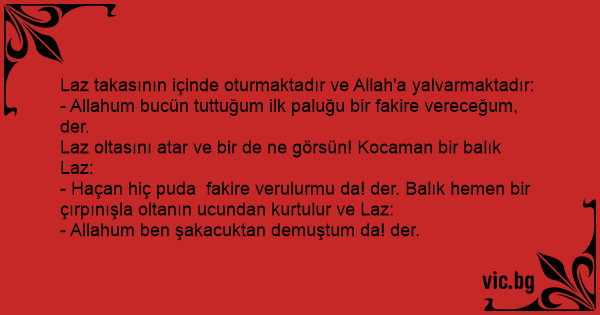 - Haçan hiç puda fakire verulurmu da! der. Balık hemen bir çırpınışla oltanın ucundan kurtulur ve Laz: